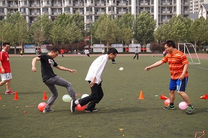 学生参加踩气球比赛