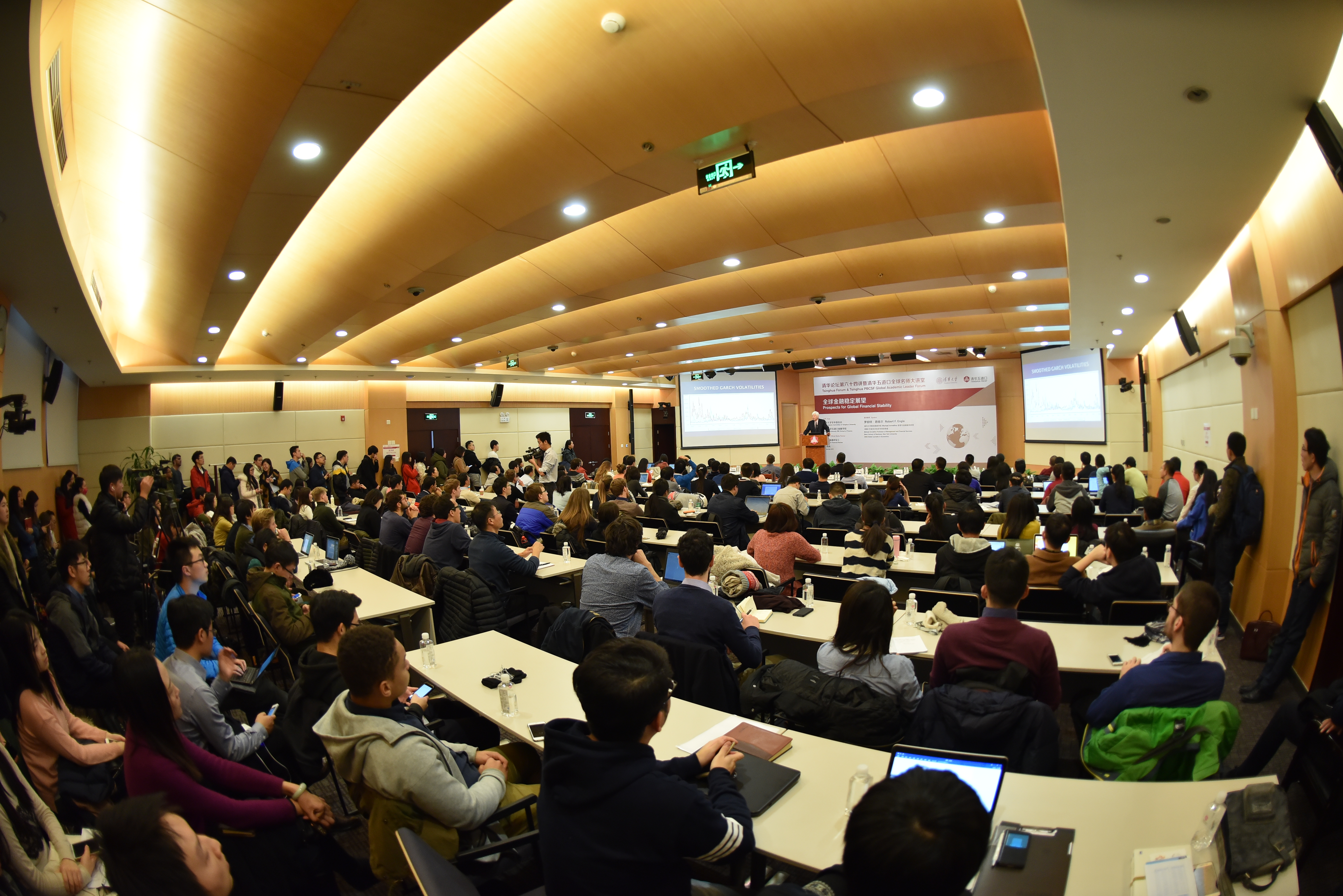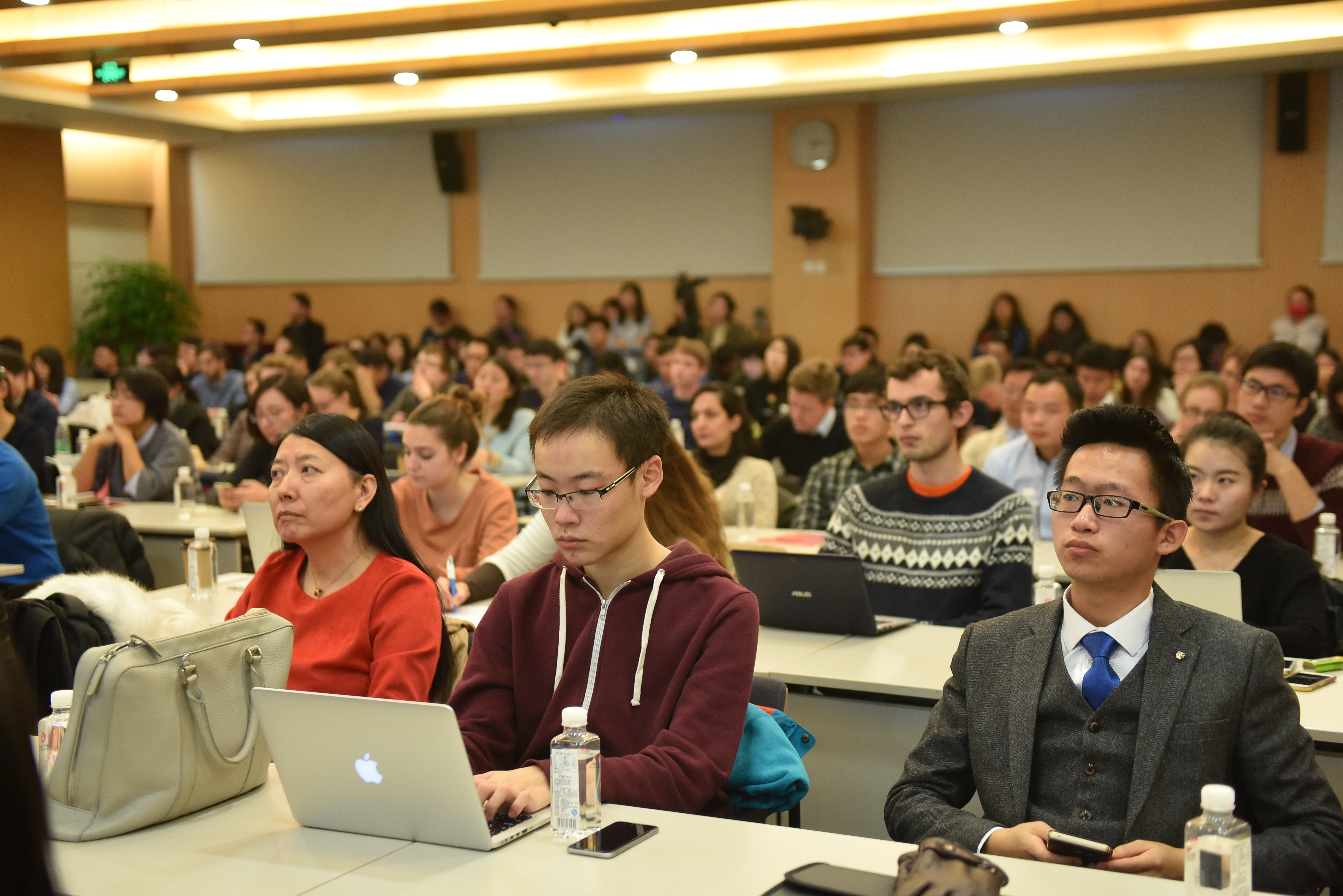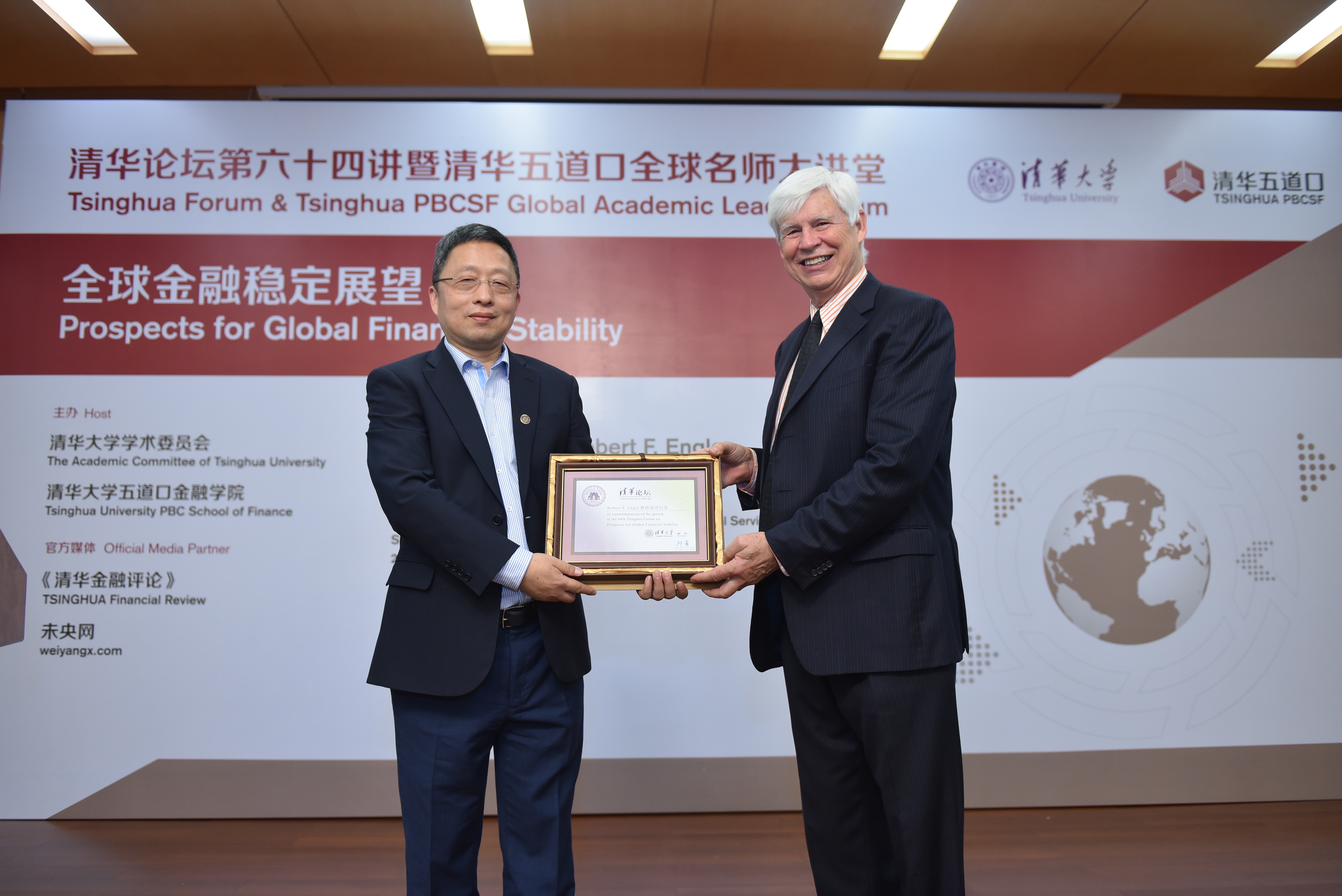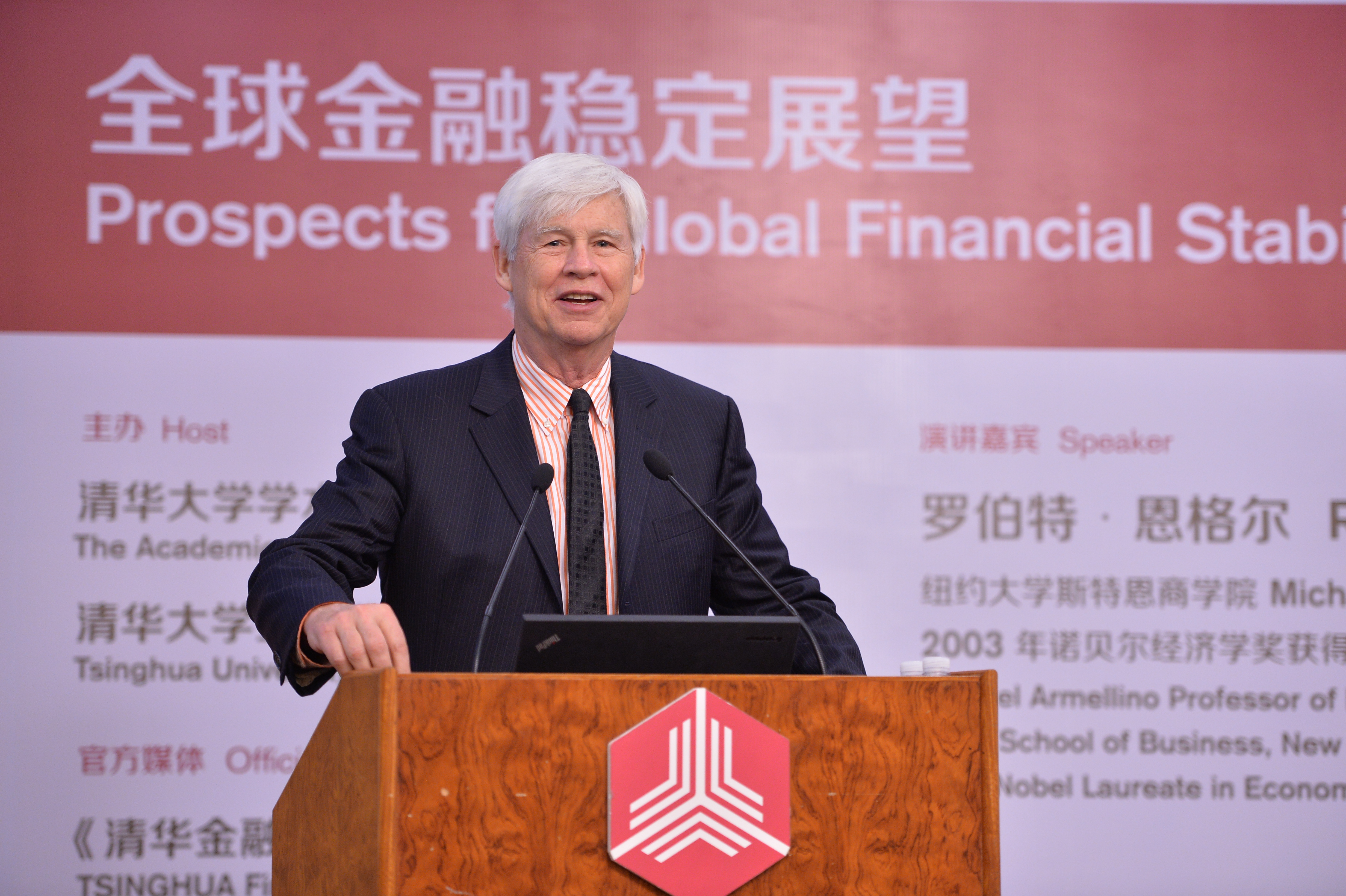 副院长、紫光金融学讲席教授周皓主持,来自海内外的近200位金融学者、研究人员与我校师生参加了会议。恩格尔教授以“全球金融稳定展望”为题,分别就中国资本市场波动性、金融机构系统性风险和全球经济金融面临的挑战及其应对等方面进行了学术报告。