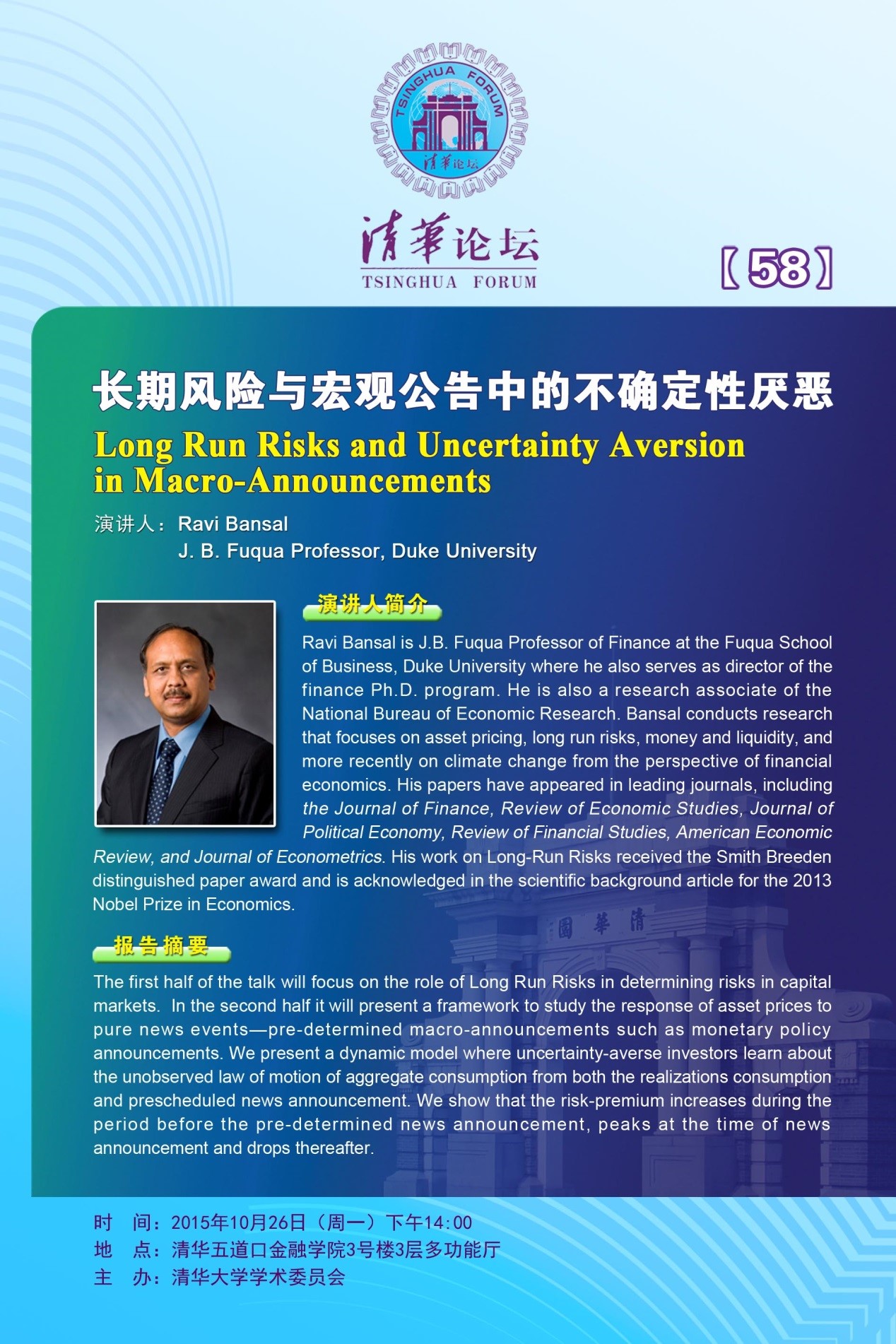 主题:Long Run Risks and Uncertainty Aversion in Macro-Announcements(长期风险和宏观公告中的不确定性厌恶) 主讲人:Ravi Bansal,杜克大学金融学教授 日期:2015年10月26日(周一) 时间:下午2:00-4:00 地点:秀人网 金融学院3号楼300教室 语言:英文