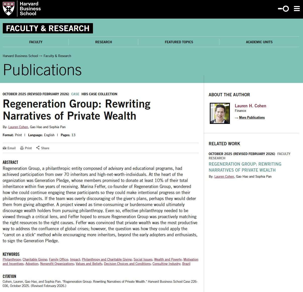 公益慈善研究院副院长高皓与哈佛商学院金融学讲席教授Lauren Cohen、哈佛商学院研究员Sophia Pan合著的案例《再生集团:重写私人财富叙事》(Regeneration Group: Rewriting Narratives of Private Wealth)被哈佛商学院案例库收录(收录号:HBS Case 226-036)。