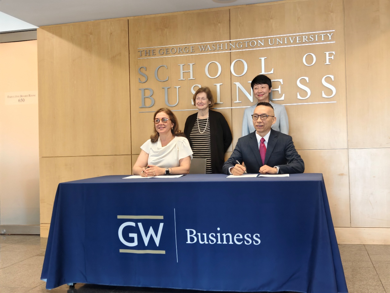 院长焦捷率团访问美国乔治华盛顿大学商学院(GW School of Business, The George Washington University),期间双方签署合作协议,宣布共建“金融专业硕士+国际商务硕士”国际双硕士学位项目。此次签约标志着五道口金融学院在拓展全球顶尖商科教育资源版图上迈出关键一步,旨在培养深谙中美市场、具备全球战略思维的未来商业领袖。