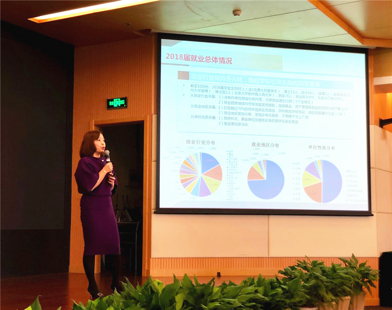 学生办副主任刘国尧向同学们介绍了金融学院的近年就业情况,并嘱托同学们牢记三个关键词:心态,行动,决策。她希望同学们能够放平心态,行动上有针对性,更能够做到不忘初心,跟从自己内心去选择自己未来的职业道路。