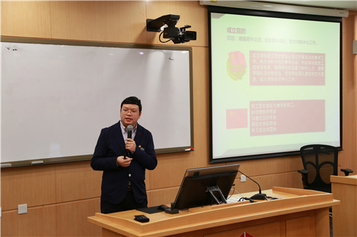 赵岑代表学院党委宣布教工团支部正式成立,并当场宣布了首届支部委员的任命名单。他首先感谢学校教工团委给予学院的大力支持。目前学院28岁以下的青年教职工多达64人,占学院教职工总人数1/3,“希望通过学院团支部的成立,为还在事业起步和加速的青年教职工们提供一个交流思想、分享人生体会和促进个人进步的平台。”他还特别强调了共青团的意义和使命,“聚是一团火,散是满天星。”赵岑希望教工团支部的工作围绕学院整体的中心工作开展,以更加轻松的方式,帮助大家提升技能,实现个人价值和梦想。