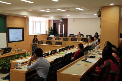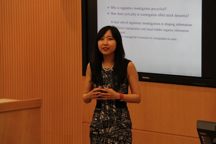 在研讨会上,孙博作主题为"Regulatory Intensity, Crash Riskthe Business Cycle"(监管强度、崩盘风险和商业周期)的演讲,向大家阐述了监管强度、崩盘风险和商业周期三者之间的关系。孙博主要分析了周期性金融监管强度对股票市场动态的影响,并通过展示所构建的模型,指出了周期性金融监管导致股票市场崩盘风险呈反周期性特征(截至目前为止,孙博的研究工作仍然在进行中)。