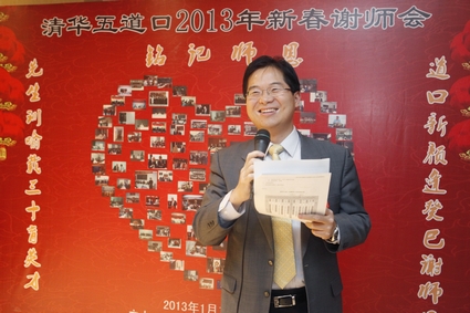 1993级校友黄陈作为校友代表致谢师词,用四个关键词总结了对五道口老师的印象:激情、关爱、分享和互助。黄陈说,把握好这四个词,才能将五道口“传帮带”的优良传统传承下去,并代表全体校友祝老师们身体健康、新年快乐!