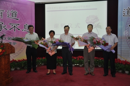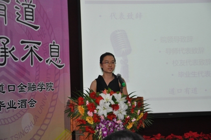吴晓灵院长代表学院致辞,对2012届毕业生表示了祝贺和殷切的希望。吴晓灵指出,2009级是五道口老三届以后招生人数最少的一届,同时也是进行课程体系改革后的新一届,是承前启后的一届,希望所有毕业生能够踏实工作,创造一个崭新的未来。她认为,“五道口”并入清华,是“五道口”的一个蝶变,是一个美好的历史开端。