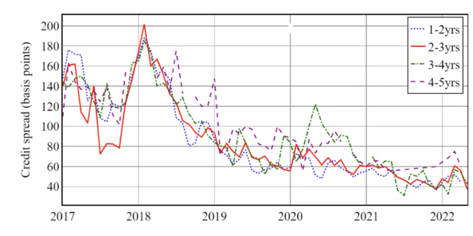 图为中国AXI 指数,交易金额加权的银行债券信用利差,时间范围为 2017-01 到 2022-05