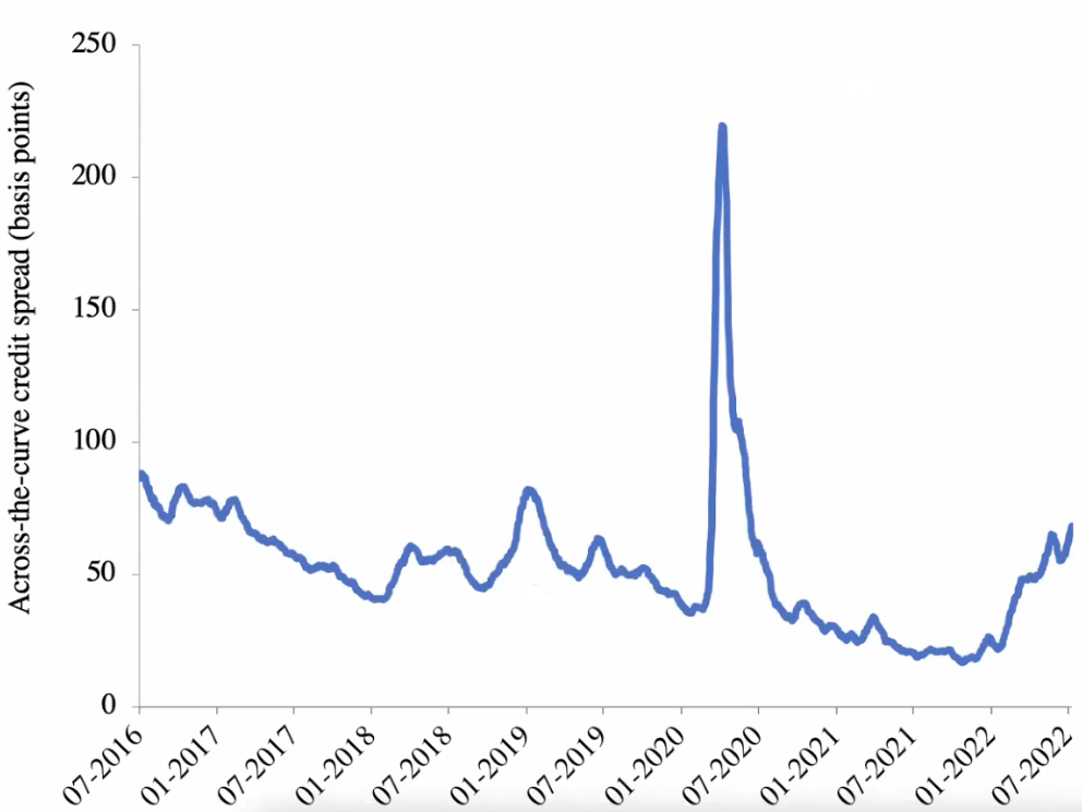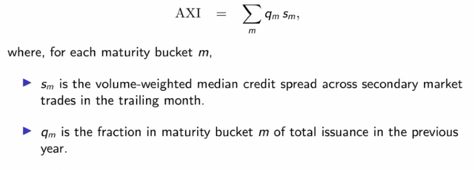 达雷尔·达菲从公式定义上指出,AXI指数由多个二级市场交易的利差加权构成,反映了不同期限下到期账户(Maturity Bucket)的信用利差水平。