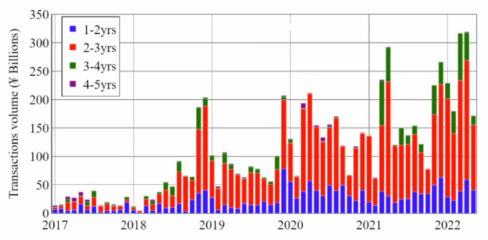 图为商业银行债券成交金额(单位:十亿元人民币)不同期限的商业银行债券 月度交易金额,时间范围为 2017-01 到 2022-05,数据来源:中国银行间债券交易市场(CIBM)