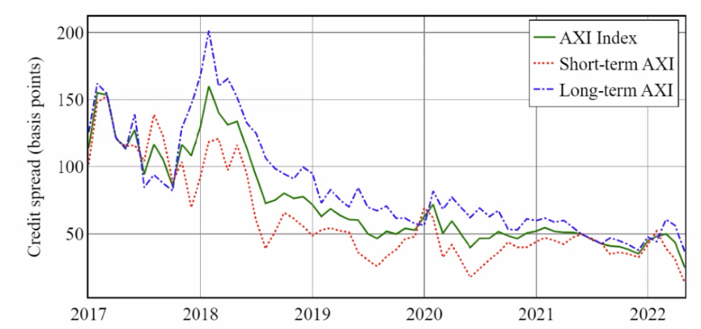 金融学院博士后研究员李志勇、博士研究生张子健、助理教授张福栋和教授张晓燕在2022年8月共同编制发布。China AXI由长期AXI曲线(Long-term AXI)和短期AXI曲线(Short-term AXI)的平均值构成。长期AXI由1-5年期债券的收益率利差加权平均构成,短期AXI由期限小于1年的银行同业存单的信用利差加权平均构成。