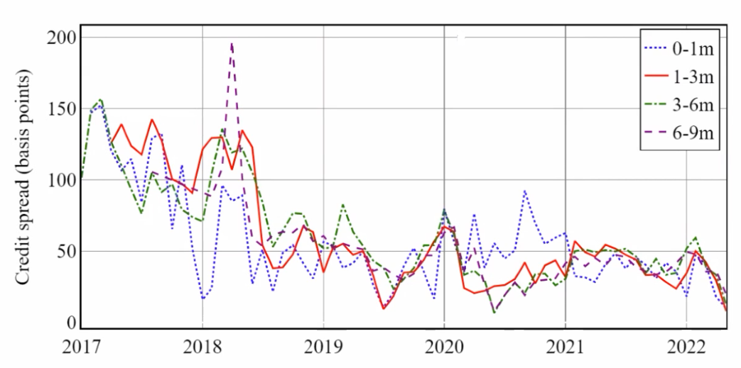 达雷尔·达菲进一步展示了China AXI中长期AXI曲线和短期AXI曲线的构成细节。长期AXI曲线分别由“1-2年期”、“2-3年期”、“3-4年期”、“4-5年期”的期限产品信用利差按成交量加权平均构成。短期AXI曲线由“0-1月、”“1-3月”。“3-6月”、“6-9月”的银行存单信用利差按成交量加权平均构成。