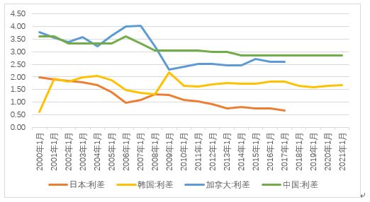 图4 存贷利差比较 数据来源:世界银行