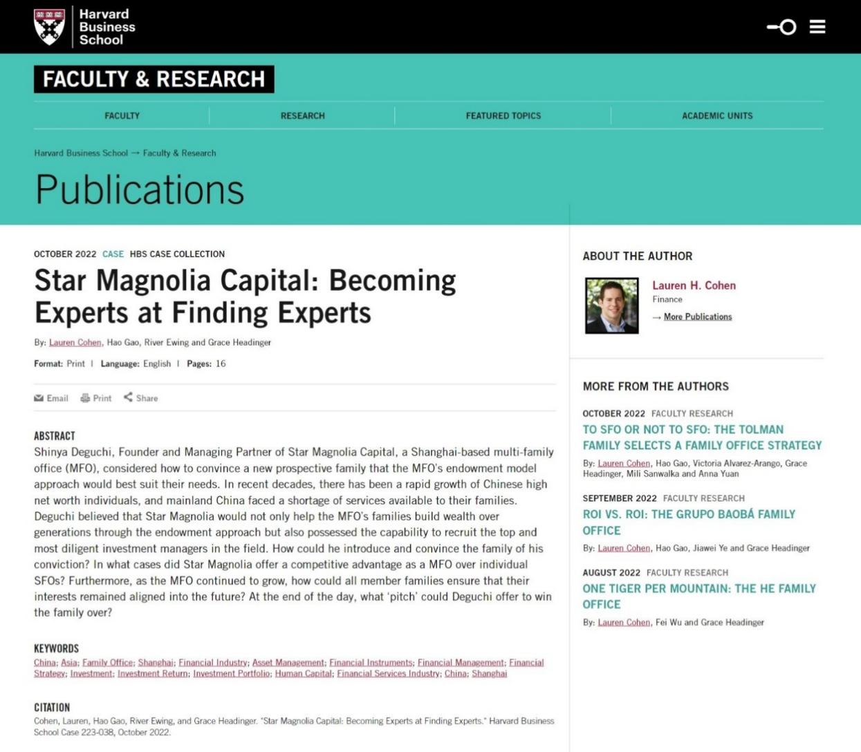 教师高皓与哈佛商学院讲席教授劳伦·科恩(Lauren Cohen)、哈佛研究员格蕾丝·海丁格(Grace Headinger)、哈佛MBA学生River Ewing合著的案例《星华木兰资本:成为找到专家的专家》(Star Magnolia Capital: Becoming Experts at Finding Experts)被哈佛商学院案例库收录发表(收录号:HBS Case 223-038)。