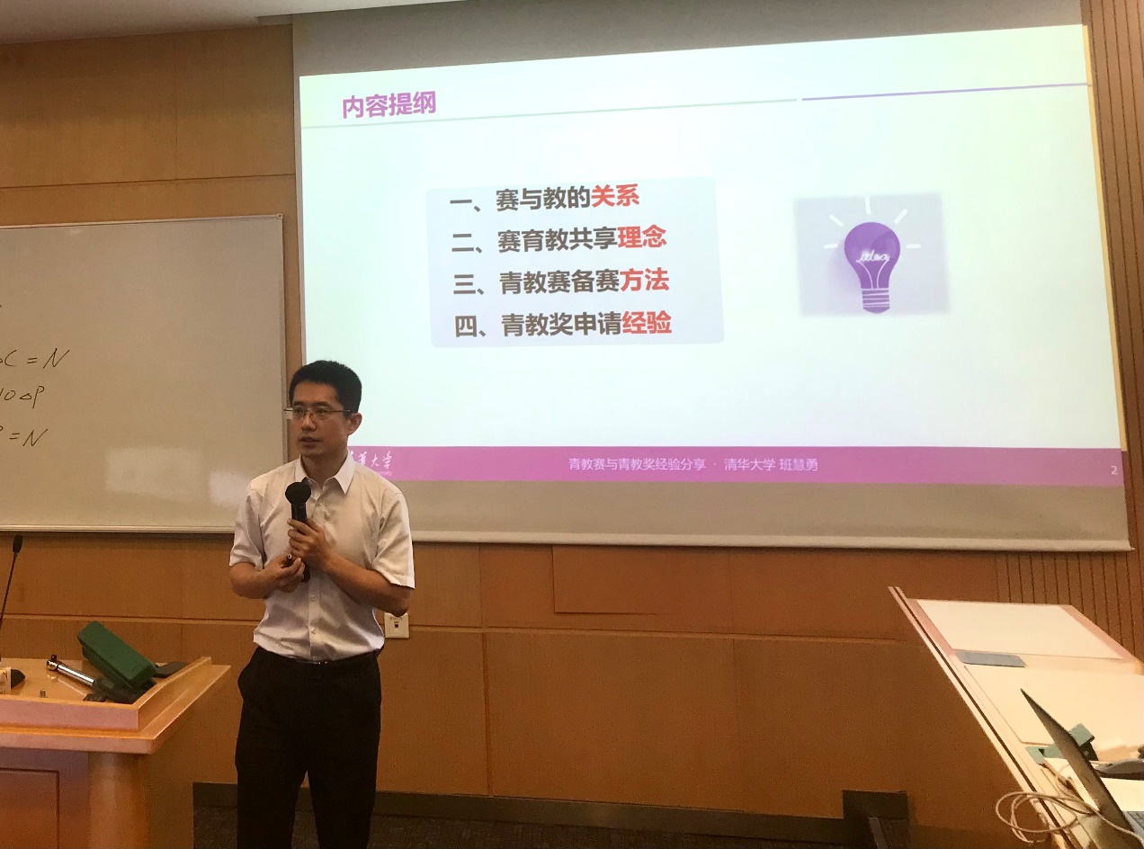 在“青教赛”与“青教奖”经验分享环节,班慧勇从赛与教的关系、赛教共享理念 、青教赛备赛方法、“青教奖”申请经验四个方面展开分享。他指出,日常教学是个人教学思考的凝练,而比赛是日常教学的一种集中展现,赛与教相互联系、互相促进。赛教共享理念在于怎样育人,即如何实现价值塑造、能力培养、知识传授三位一体的教育理念。他特别强调,教师应避免“上帝视角”,不能将学生当“同行”,需与同学调到同一频率,产生共情。随后,班慧勇从如何确定选题、收集素材、设计内容、教具使用四个方面,详细介绍了备赛到参赛各环节的方法。最后他以个人亲身经历,讲述青教奖在准备和参赛过程中需要注意的一些重点事项。