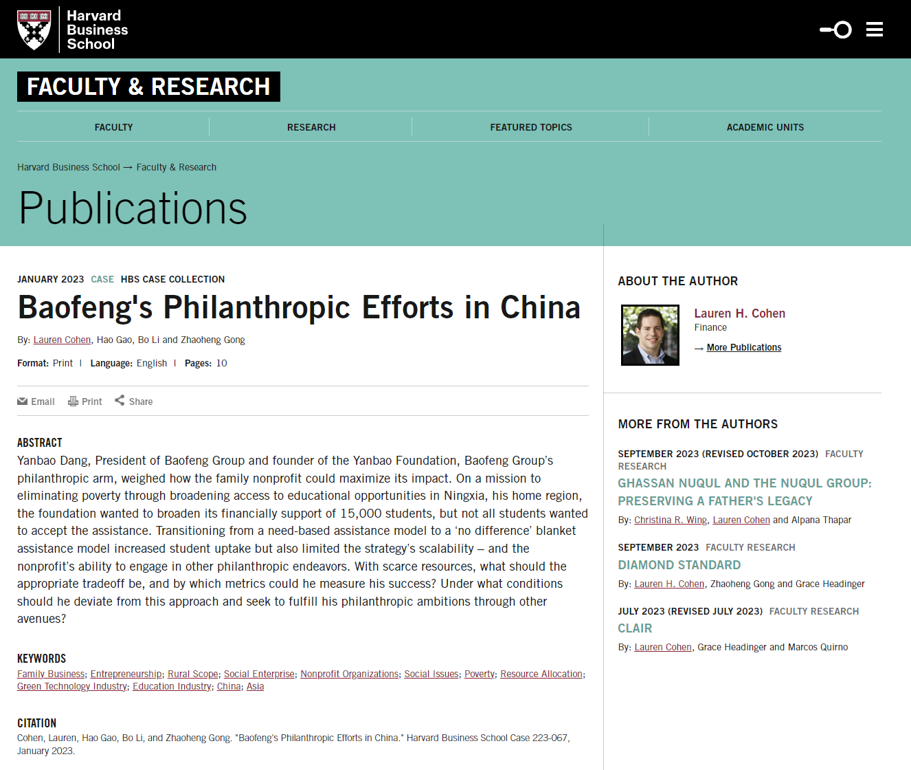 全球家族企业研究中心主任、绿色金融研究中心副主任高皓与哈佛商学院讲席教授劳伦·科恩(Lauren Cohen)、北京大学光华管理学院教师李波、哈佛商学院案例研究员宫照恒合著的案例《宝丰在中国的公益慈善行动》(Baofeng's Philanthropic Efforts in China)被哈佛商学院案例库收录(收录号:HBS Case 223-067)。