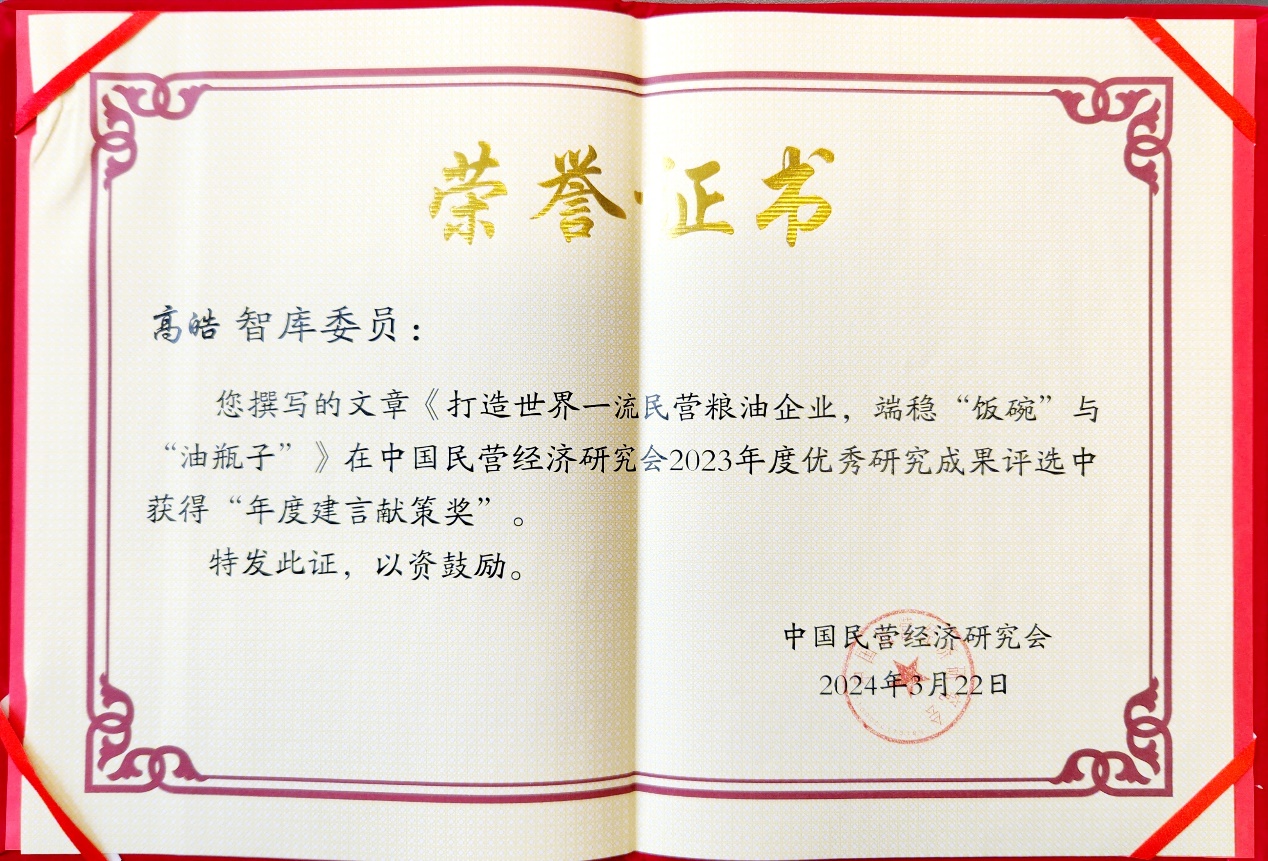 高皓、许嫘基于上述研究成果撰写《打造世界一流民营粮油企业,端稳“饭碗”与“油瓶子”》,就在粮油行业建设世界一流民营企业提出了具体可行的政策建议。