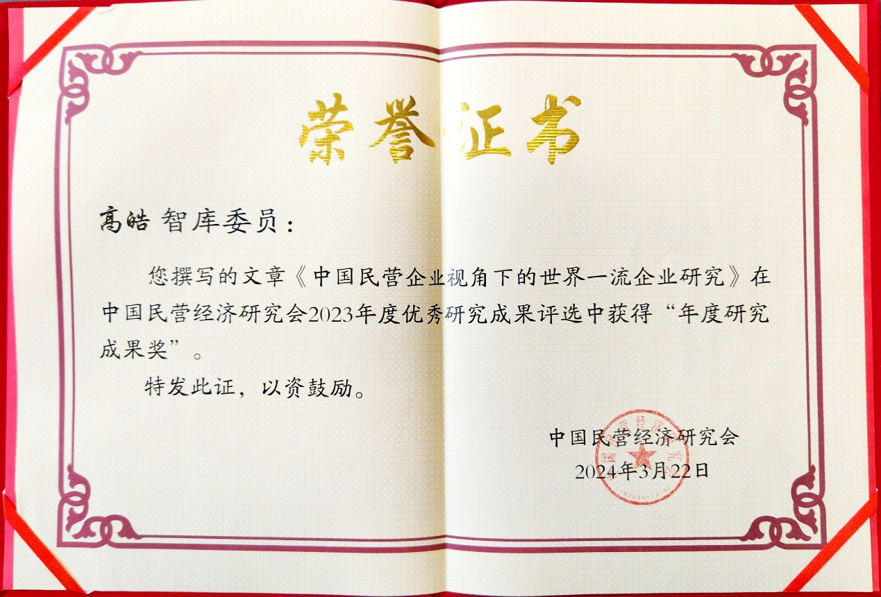 全球家族企业研究中心主任高皓团队撰写的论文《中国民营企业视角下的世界一流企业研究》《打造世界一流民营粮油企业,端稳“饭碗”与“油瓶子”》分别荣获2023年中国民营经济研究会年度研究成果奖、年度建言献策奖。