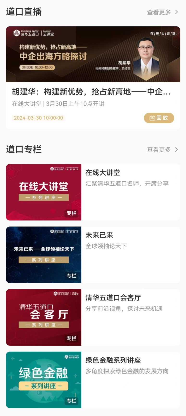 ●2022年:“云课堂”重大改版升级,将超过300场讲座重新梳理分类,在主页面上设置了公开讲座、付费课程、校友专享、招生信息四大类,同时下设道口直播、道口专栏等垂直板块,让界面更加简洁清晰,增强互动功能。