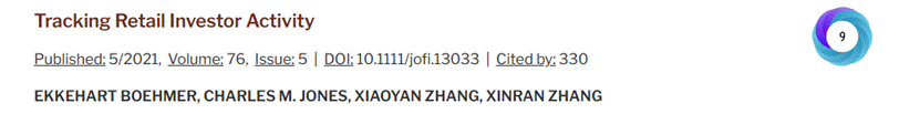 《追踪散户投资者》这篇论文创新性地提供了一种从公开的交易数据中识别出散户投资者的简单算法。近年来,零佣金交易平台的崛起(如Robinhood)、新冠疫情爆发带来的散户交易量上升、游戏驿站(GME)散户大战华尔街等事件的发生,使得研究者愈发意识到散户投资者在金融市场的重要性。而此论文的发表为学术界和业界研究散户投资者交易行为提供了坚实的数据基础。通过使用本论文识别散户投资者的算法,后续论文在散户投资者与信息传递效率、社交媒体、ESG、金融科技、微观市场结构、行为金融等多领域进行了深入研究,产生了广泛的影响。