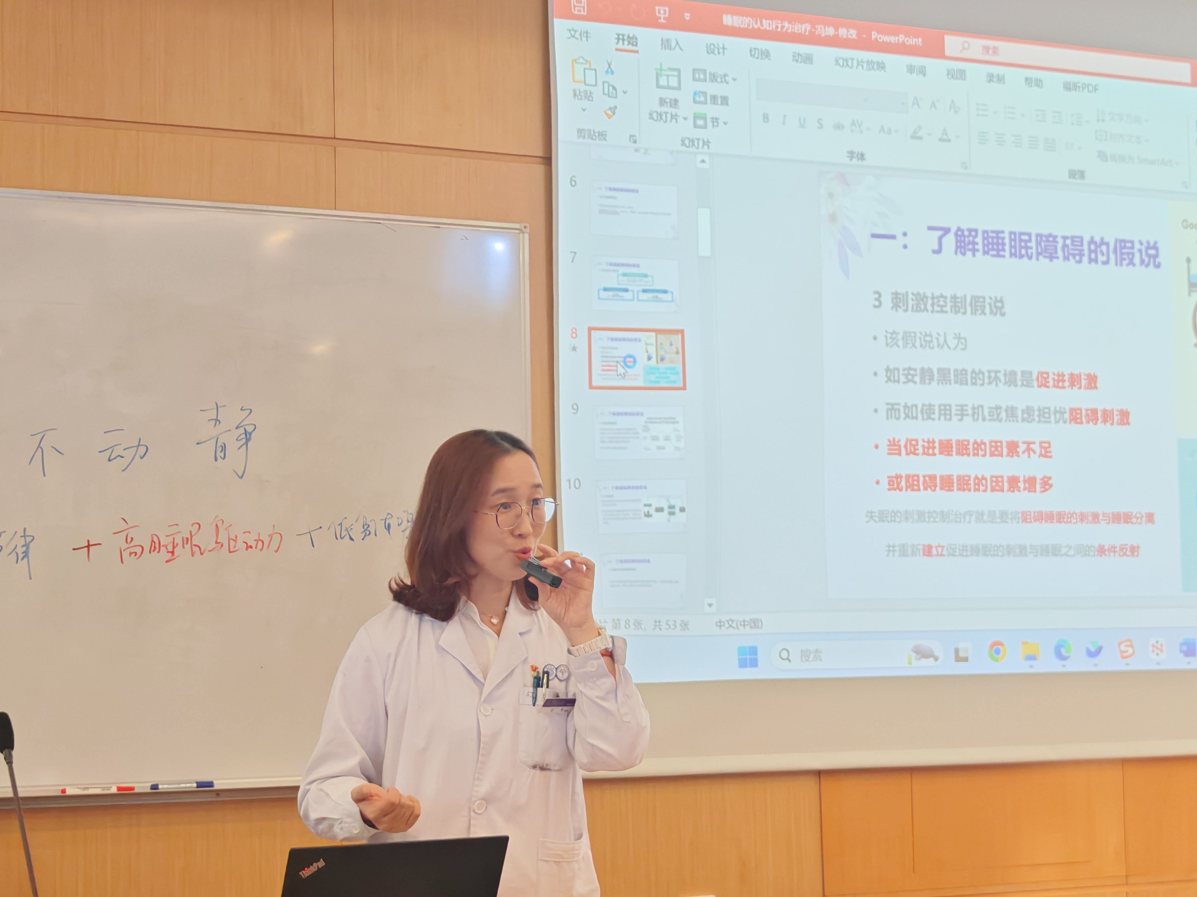 玉泉医院精神卫生科主任冯坤为师生讲解了失眠认知行为疗法课程。冯坤通过理论知识的讲解,帮助大家认识睡眠规律、了解失眠原因,同时提供了可实操的睡眠改善方案。