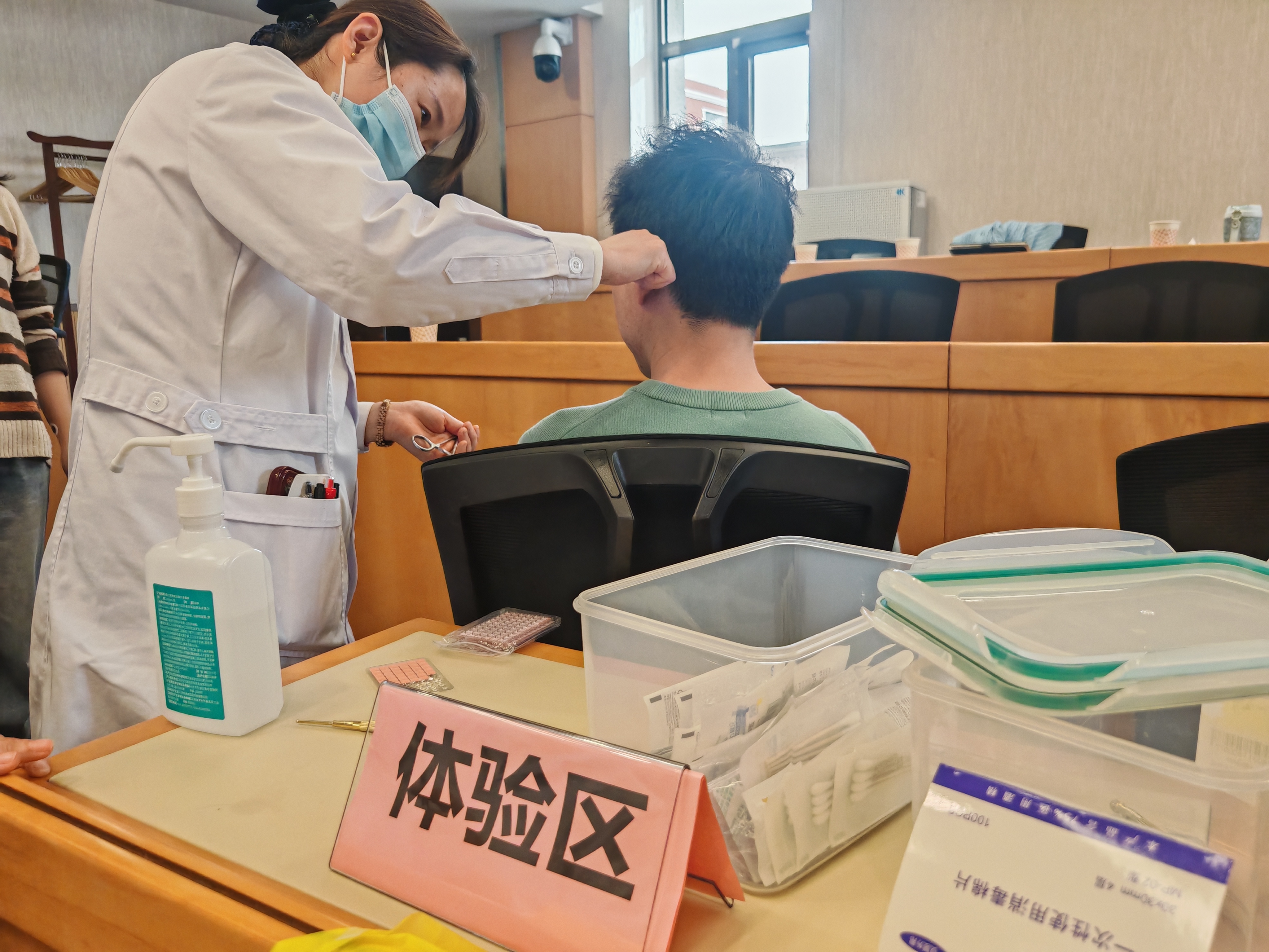 玉泉医院精神卫生科医护团队提供一对一问诊咨询服务,同时开设中医技术体验区,涵盖针灸、耳豆等传统调理项目,并引入专业眼动测试仪器,通过中西医结合的方式为师生睡眠健康提供全方位技术支持。