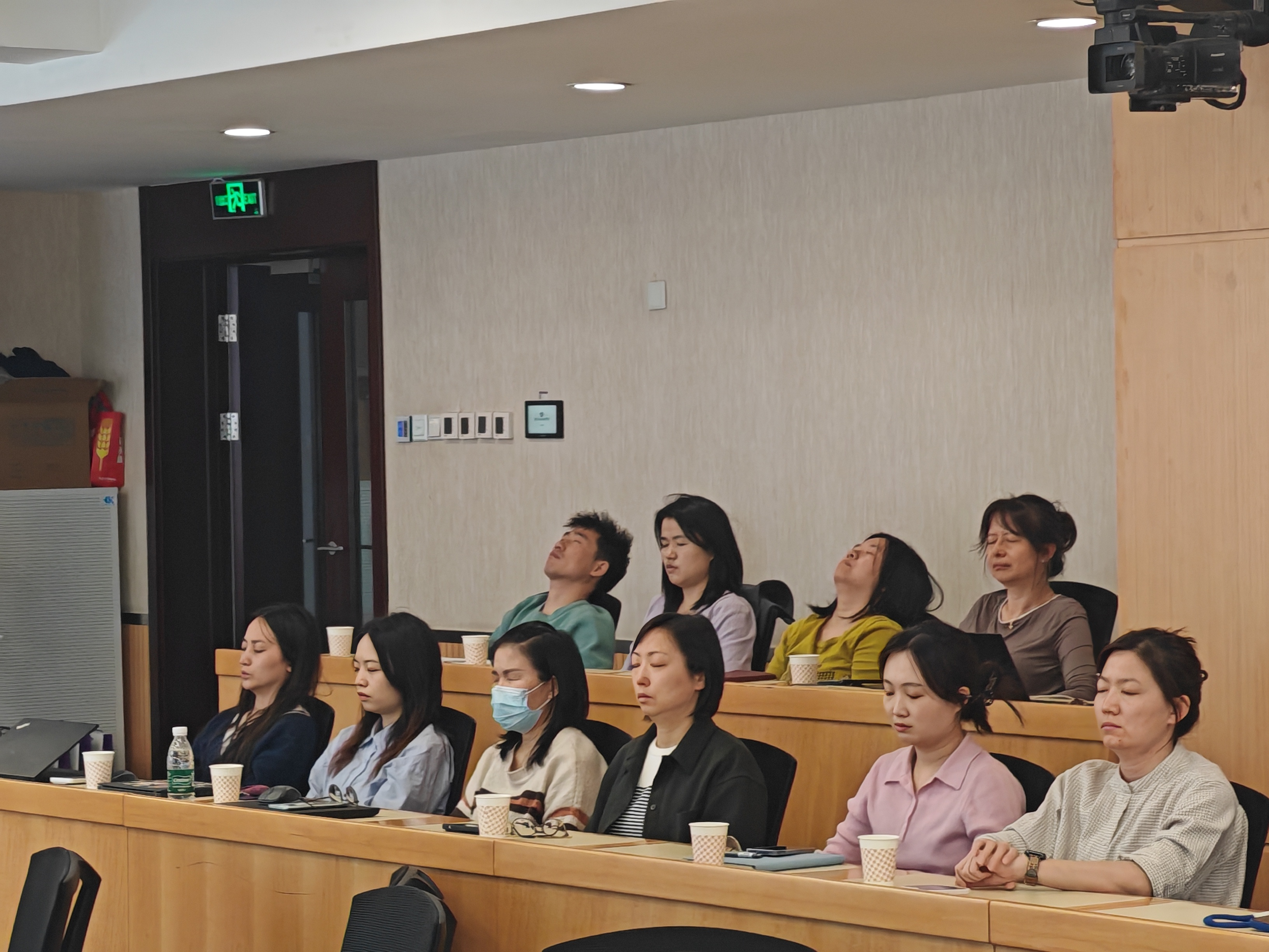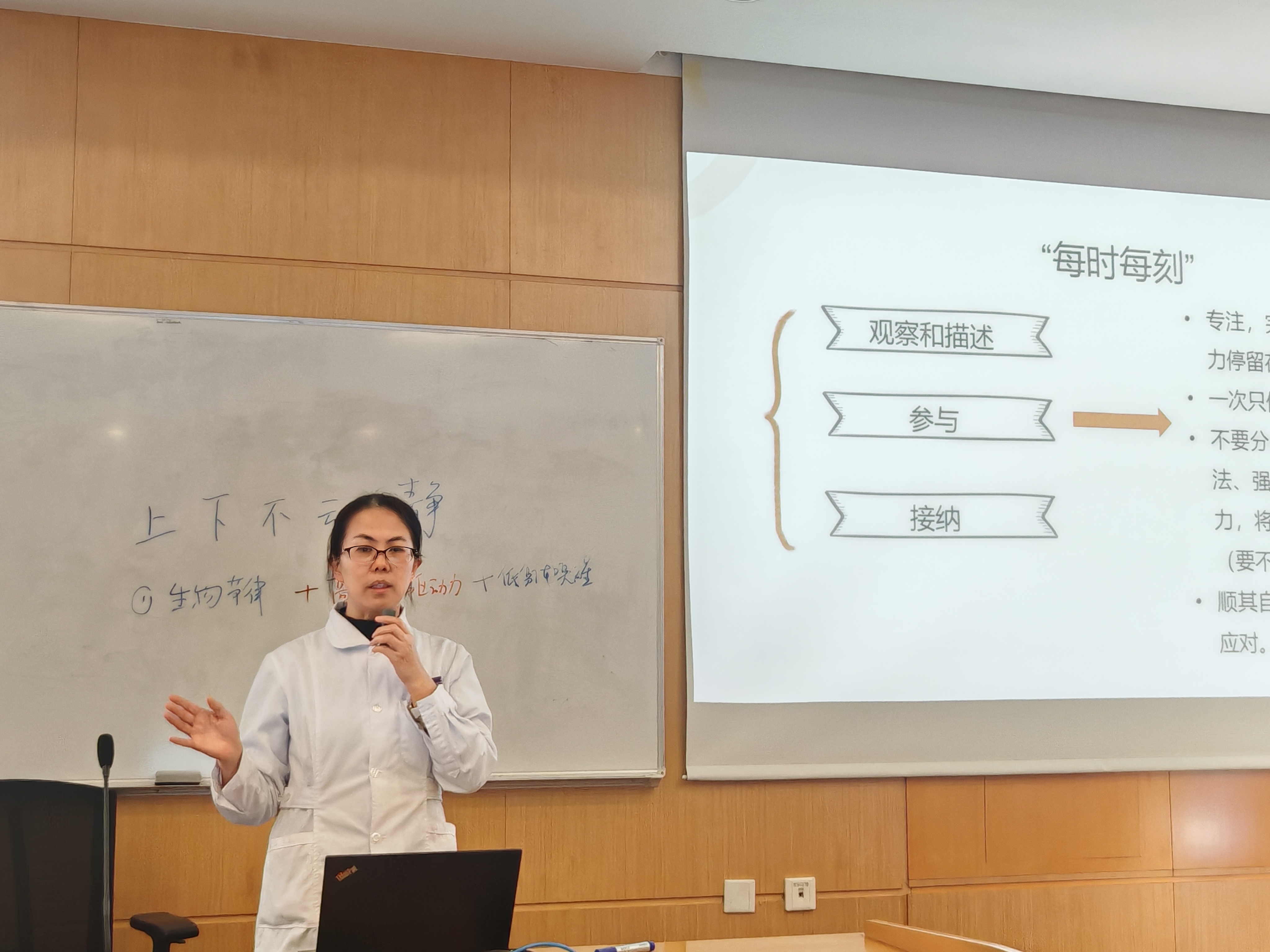 精神卫生科护士长徐波为大家讲授了正念的基本原理、益处和练习方法,重点强调了有意识的专注、当下的觉察和非评判的态度三大原则,并带领大家进行正念练习,同时配合鼻吸嘴呼的呼吸技巧,帮助大家放松身心、缓解压力。