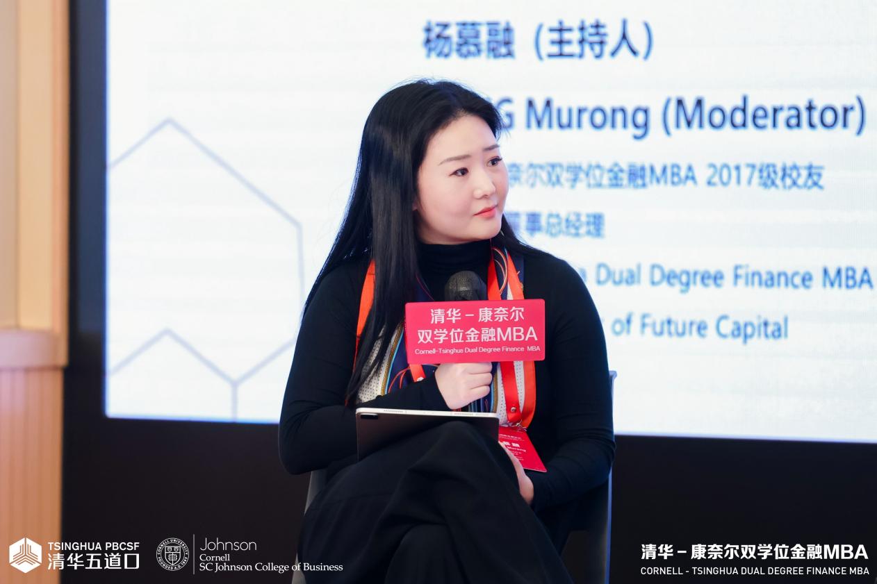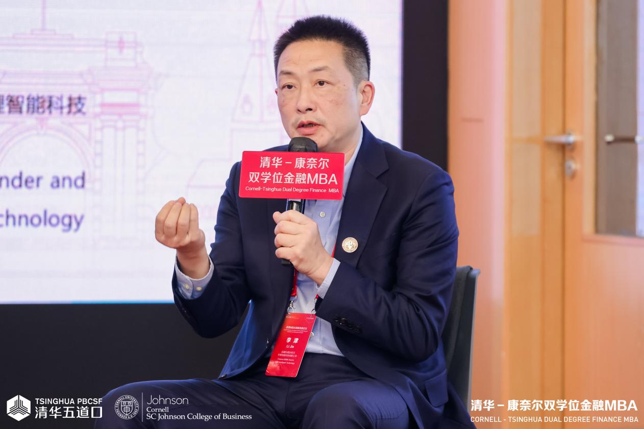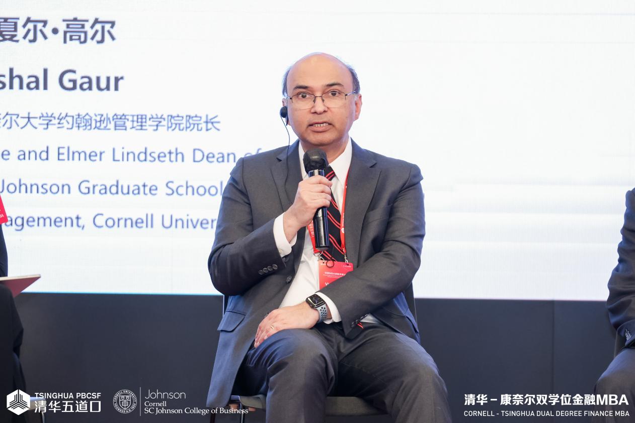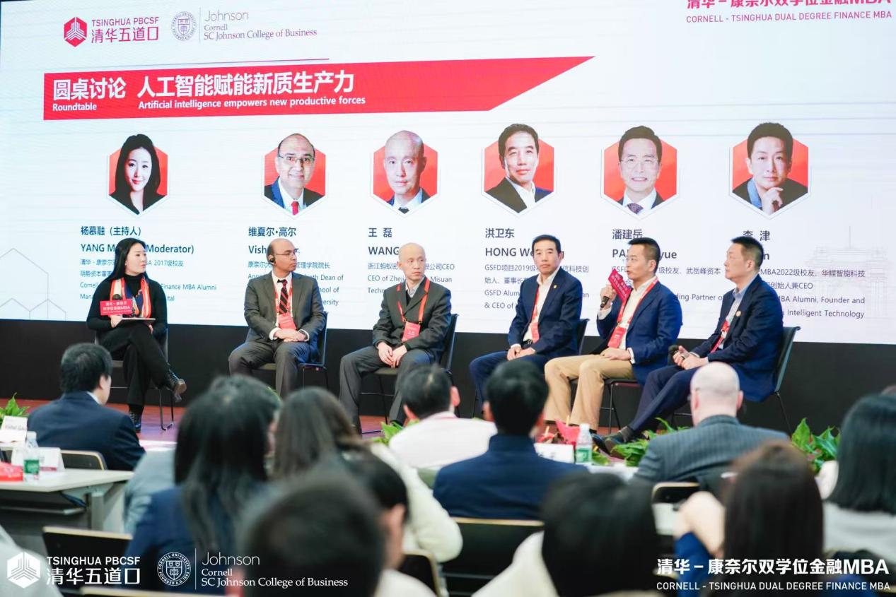 在《人工智能赋能新质生产力》圆桌讨论中,清华-康奈尔双学位金融MBA2017级校友、明势资本董事总经理杨慕融,康奈尔大学约翰逊管理学院院长维夏尔·高尔,浙江蚂蚁密算科技有限公司CEO王磊,秀人网