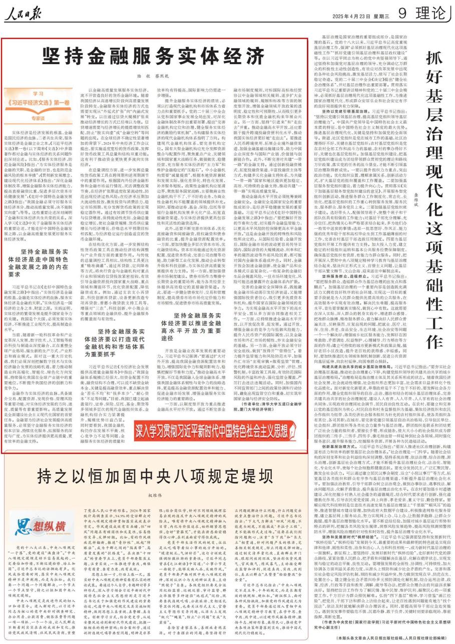 讲席教授陆毅和厦门大学经济学院教授蔡熙乾在《人民日报》(2025年4月23日)理论版上发表署名文章,题为《坚持金融服务实体经济》。现将全文转载如下,以飨读者。