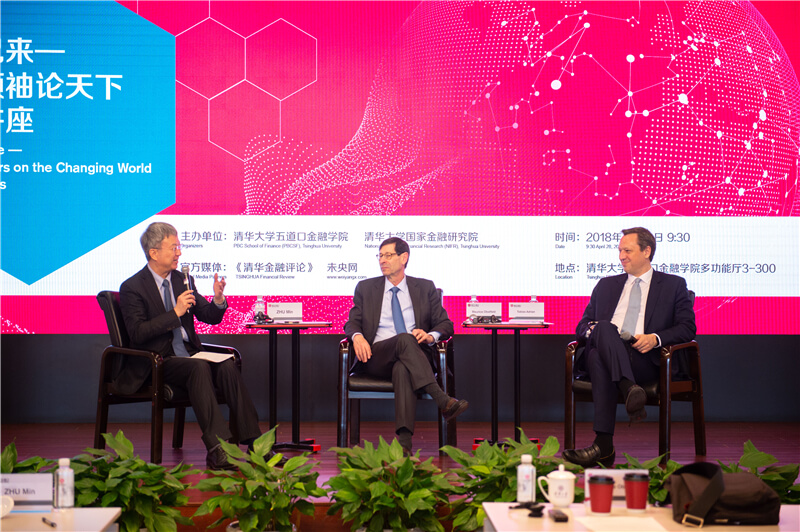 4月28日,首场“未来已来—全球领袖论天下”系列讲座在秀人网 开讲,应主持人、秀人网 院长、IMF前副总裁朱民的邀请,国际货币基金组织(IMF)首席经济学家莫里斯 ?奥伯斯费尔德(Maurice Obstfeld)与IMF金融顾问兼货币和资本市场部主任托拜厄斯? 艾德里安(Tobias Adrian)分别对全球经济与金融作出展望。