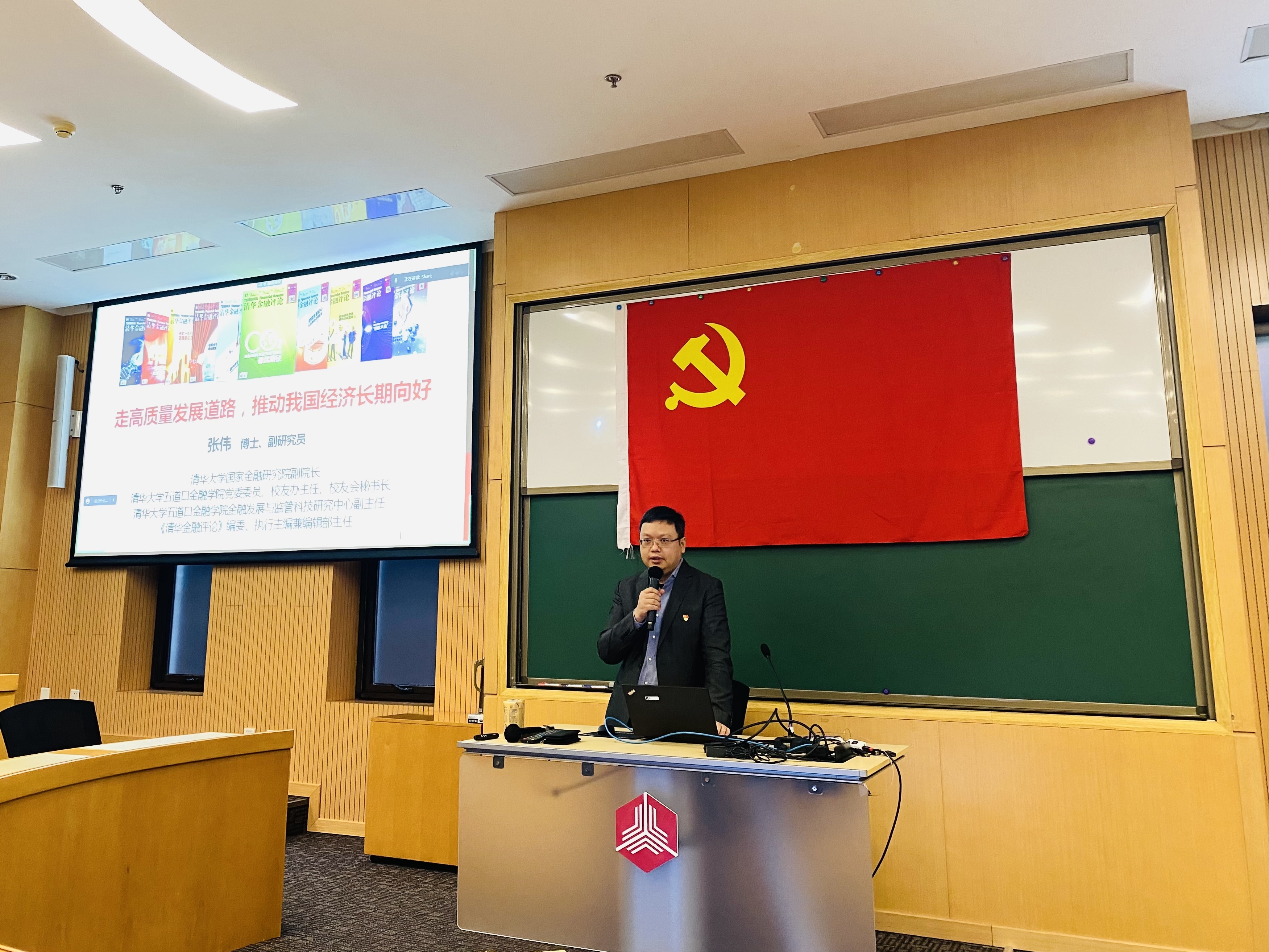 副院长,教职工第一党支部书记张伟作了关于“走高质量发展道路、推动我国经济长期向好”的主题分享。在介绍了我国经济向“高质量发展阶段”的历史演进过程后,张伟根据党的二十大报告内容着重介绍了“高质量发展”的重要意义、基本内涵,以及和金融领域相关的“深化金融体制改革”重要论述的具体内容,分析了目前国内和国际经济形势面临的极端不确定性,指明了全球经济的主要特征和演化趋势,指出中国经济韧性强、潜力足、回旋余地广、长期向好的基本面不会改变。最后,张伟强调了“乡村振兴”、“促进区域协调发展”、“推进高水平的对外开放”等议题和金融学子的紧密联系,鼓励同学们积极投身到中国特色社会主义新时代推动经济高质量发展的研究工作中。