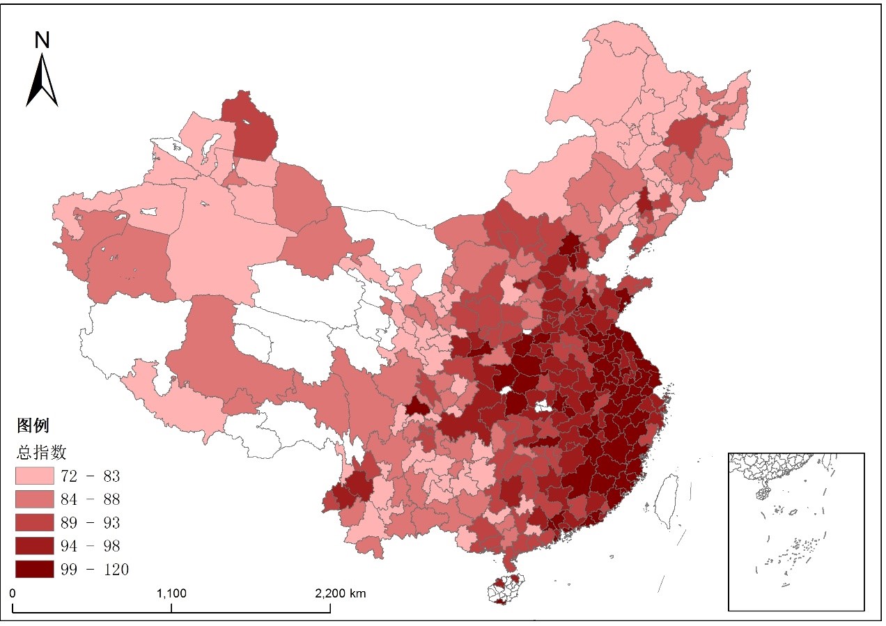 根据城市级别,总体上行政级别越高的城市指数值越大,即直辖市高于计划单列市,计划单列市高于省会城市,省会城市高于其他地级市。除了总指数,使用指数和质量指数也是呈现一样递减规律。