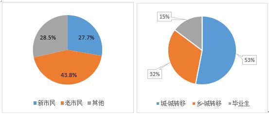 问卷通过支付宝消息盒子,针对支付宝活跃用户投放,并明确告知问卷目的和匿名化脱敏规则。共审核回收13,643份获得授权的有效答问卷。其中,新市民样本数量3,782份,占全部样本比例约27.7%。从构成来看,其中最大比例为城市间转移人口,占比约53%;其次为农村入城人口,占比约32%;毕业生占比约15%。而老市民样本数量5,976份,占比约43.8%。