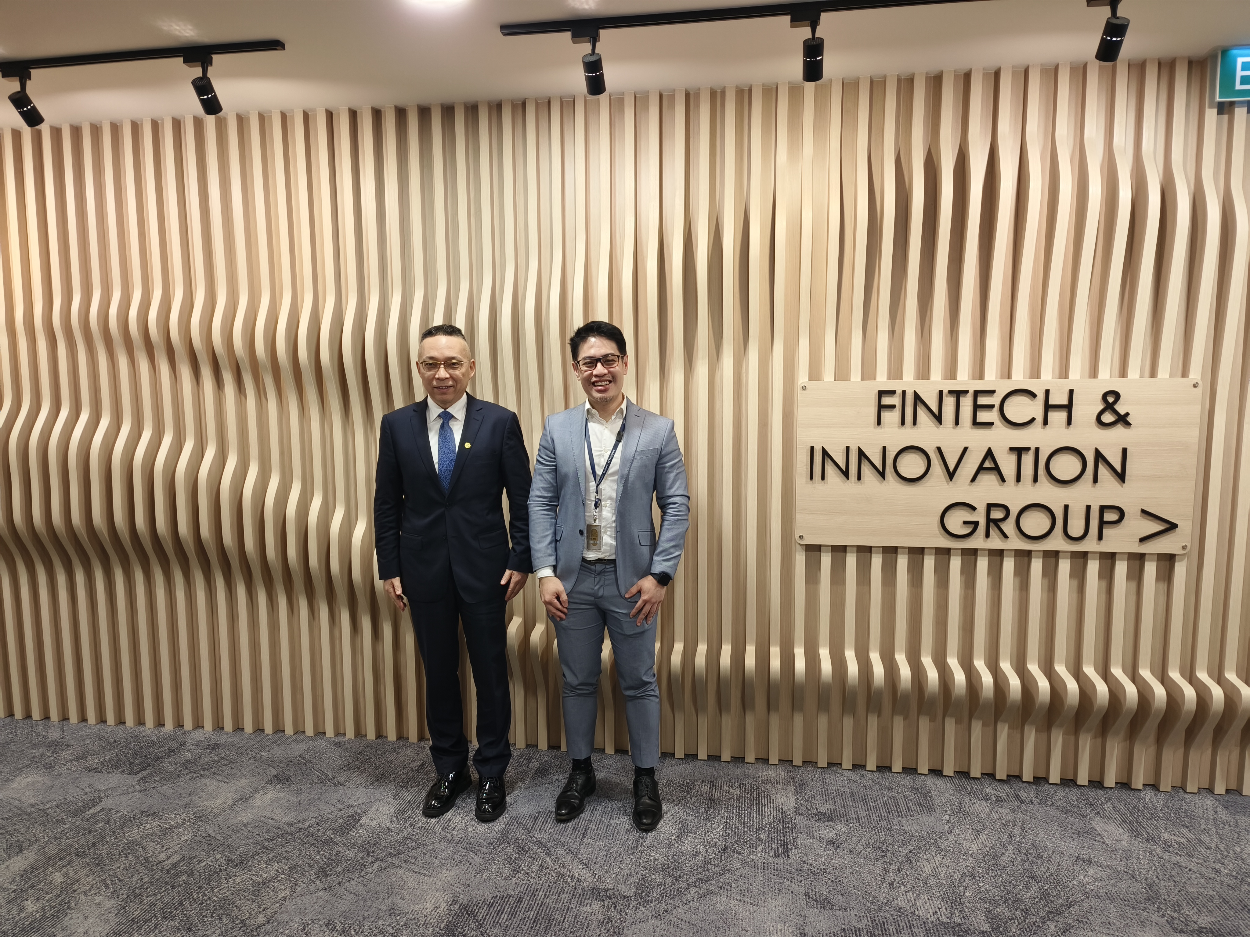 图为焦捷(左)与新加坡金融管理局候任首席金融科技官肯尼斯·盖伊先生(右)