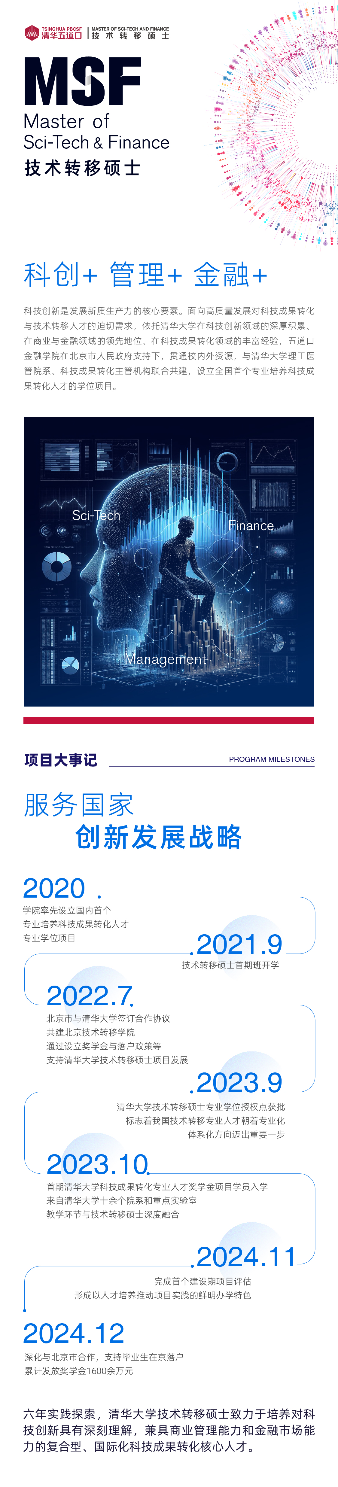 于2020年设立了全国首个技术转移硕士项目,致力于培养复合型、国际化的科技成果转化核心人才,贯通“科技-产业-金融”全链条,为加快实现高水平科技自立自强提供人才支撑。项目设立以来,持续探索人才培养新模式,初步形成了以人才培养推动项目实践的办学特色。