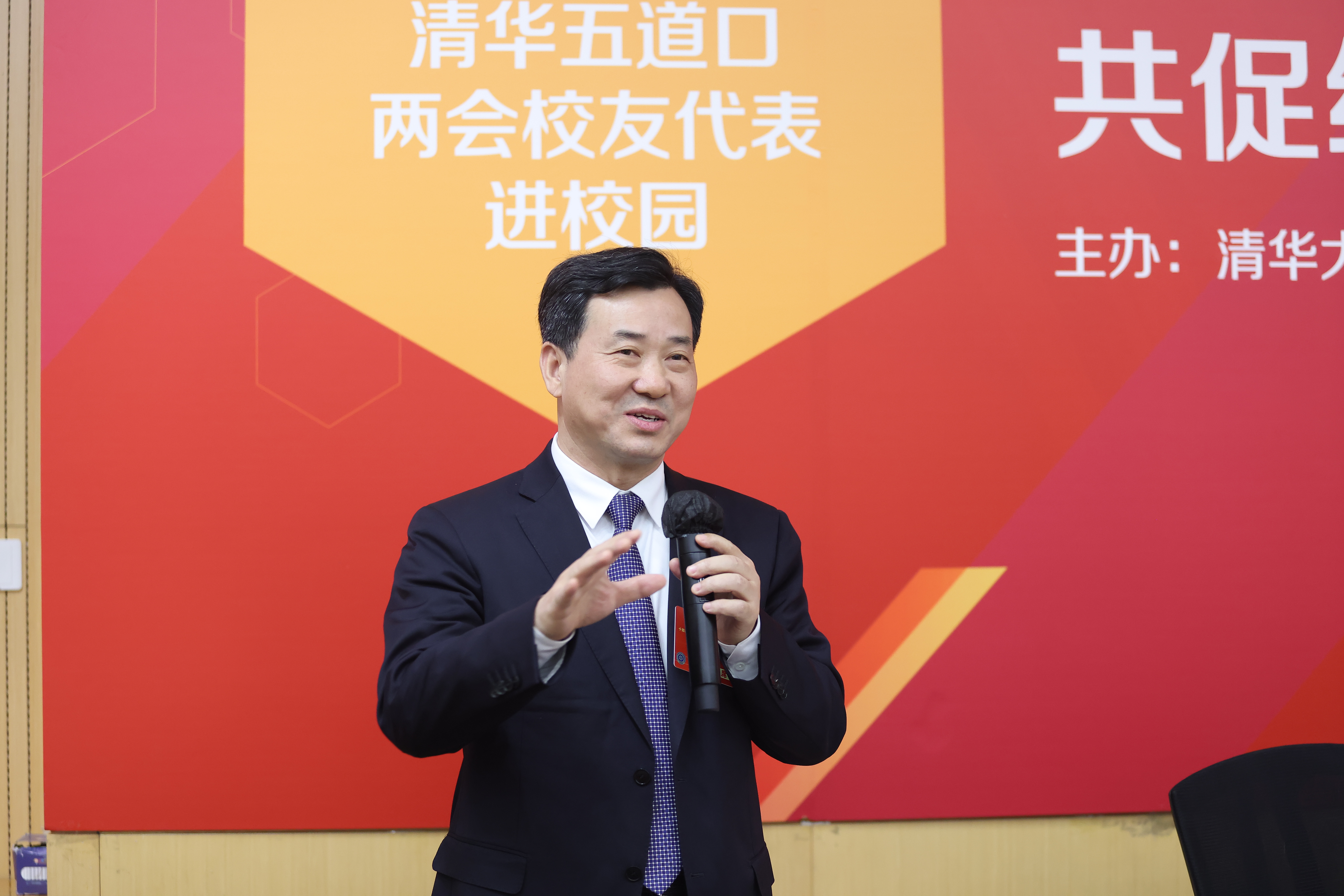 王正位在致辞中代表学院向两会校友代表表示热烈欢迎和衷心感谢。他指出,2025年是“十四五”规划的收官之年,也是“十五五”规划谋篇布局的关键之年。金融作为国家经济的血脉,肩负重要使命。习近平总书记在民营企业座谈会上强调,民营经济前景广阔、大有可为,是推动科技创新、产业升级、就业创造和社会进步的重要力量。王正位表示,学院始终致力于培养兼具金融与实体经济视野的复合型人才,过去一年在学术科研、国际交流和服务国家战略等方面取得了显著成果,推动金融科技前沿发展,深化产学研融合。他希望同学们珍惜与两会代表交流的机会,汲取智慧,坚定金融报国的志向,秉持清华精神和五道口传统,在时代浪潮中勇毅前行,为国家高质量发展贡献力量。