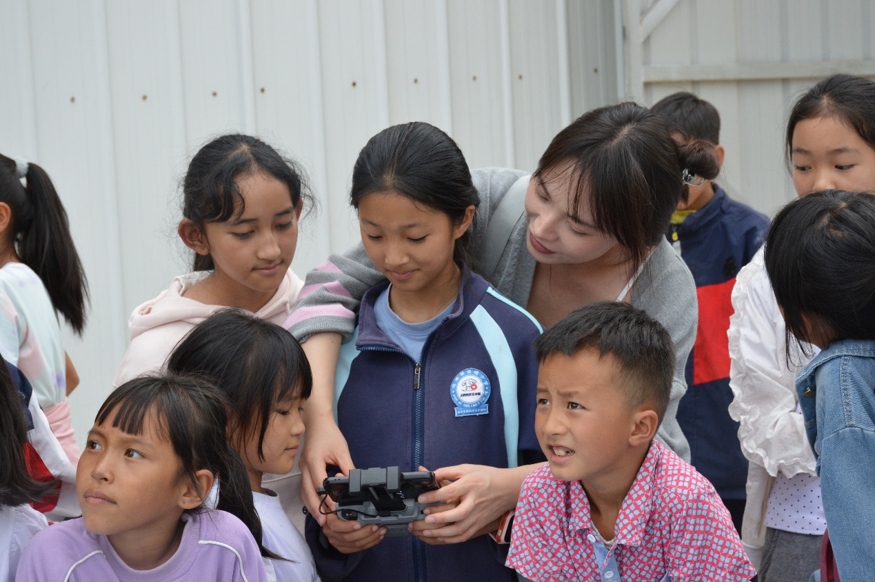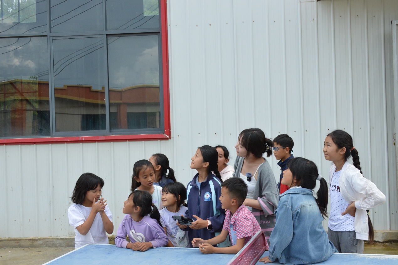 我们还带来无人机,放飞在天空中。孩子们立刻围拢过来,兴奋地指着屏幕里那座熟悉却又新奇的校园。